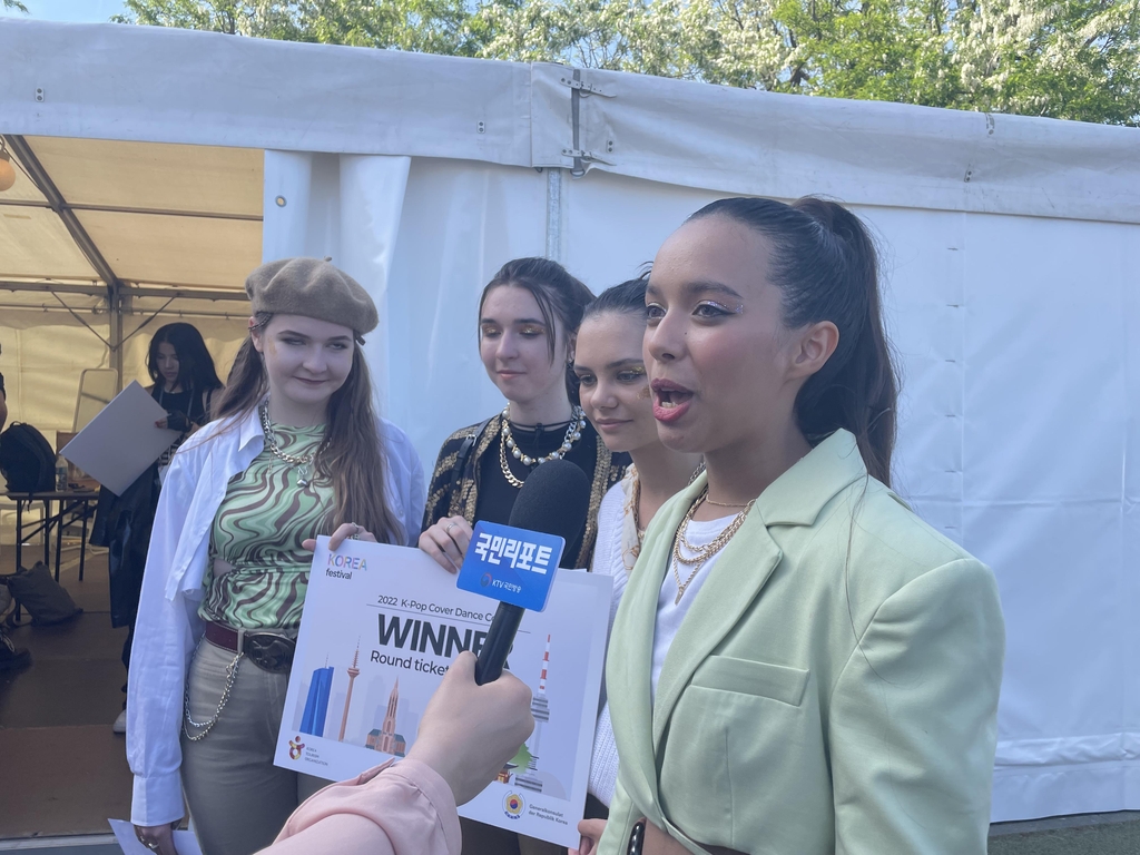 | ▲ 유럽 K팝 커버댄스 대상 거머쥔 영 네이션 (프랑크푸르트=연합뉴스) 이율 특파원 = 유럽 각국의 참가자들이 응모한 K팝 커버댄스 대상을 거머쥔 영네이션이 기자들과 인터뷰하고 있다 2022. 5.14 |