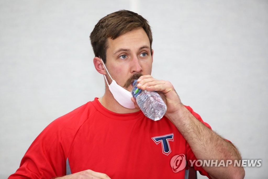 ▲ Daniel Mengden of the Kia Tigers drinks water during a press conference at Gwangju-Kia Champions Field in Gwangju, 330 kilometers south of Seoul, on Feb. 2, 2021. (Yonhap)