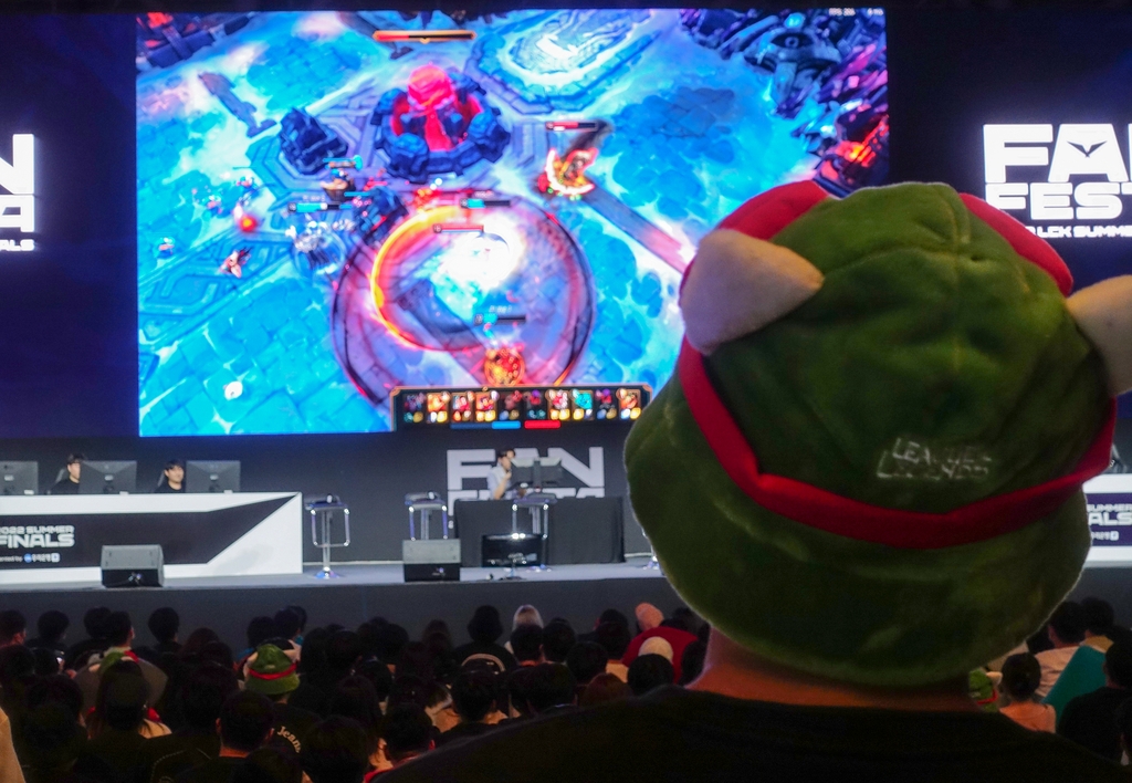 | ▲ 경기 지켜보는 LoL 팬 (강릉=연합뉴스) 김주환 기자 = 27일 강원 강릉시 강릉올림픽파크 스피드스케이팅 경기장에서 열린 'LCK 팬 페스타' 행사에서 게임 캐릭터 '티모' 모자를 쓴 시민이 이벤트 매치를 관람하고 있다. 2022.8.27 jujuk@yna.co.kr |