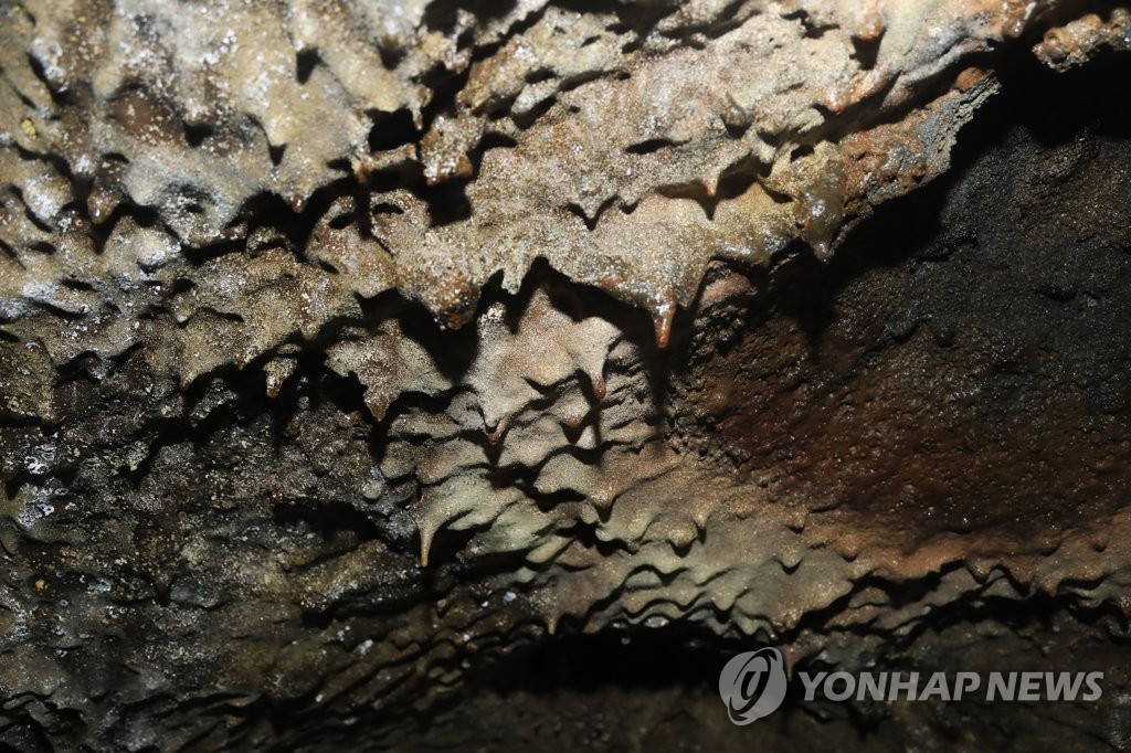 | ▲ 자연의 신비를 찾아서 (제주=연합뉴스) 백나용 기자 = 2021 세계유산축전 150일을 앞둔 4일 오전 제주시 조천읍 벵뒤굴에서 제주도 세계자연유산센터 주최로 언론 현장 브리핑이 진행되고 있다. 사진은 벵뒤굴 천장에 있는 종유석. 2021.5.4 dragon.me@yna.co.kr |