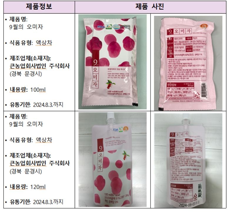 회수대상은 큰들농업회사법인이 제조·판매한 액상차인 '9월의 오미자'다. 납 기준치는 1㎏당 0.3㎎인데 해당 제품은 납이 2.2㎎ 검출됐다. 유통기한은 2024년 8월 3일로 표시됐으며 내용량은 100·120㎖ 두 종류다. 지금까지 597.4㎏이 생산됐다.