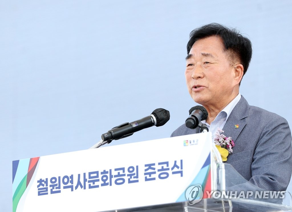 | ▲ 철원역사문화공원 준공식 (철원=연합뉴스) 양지웅 기자 = 27일 강원 철원군 철원읍 사요리에서 열린 철원역사문화공원 준공식에서 최현종 군수가 인사말을 하고 있다. 2022.7.27 yangdoo@yna.co.kr |