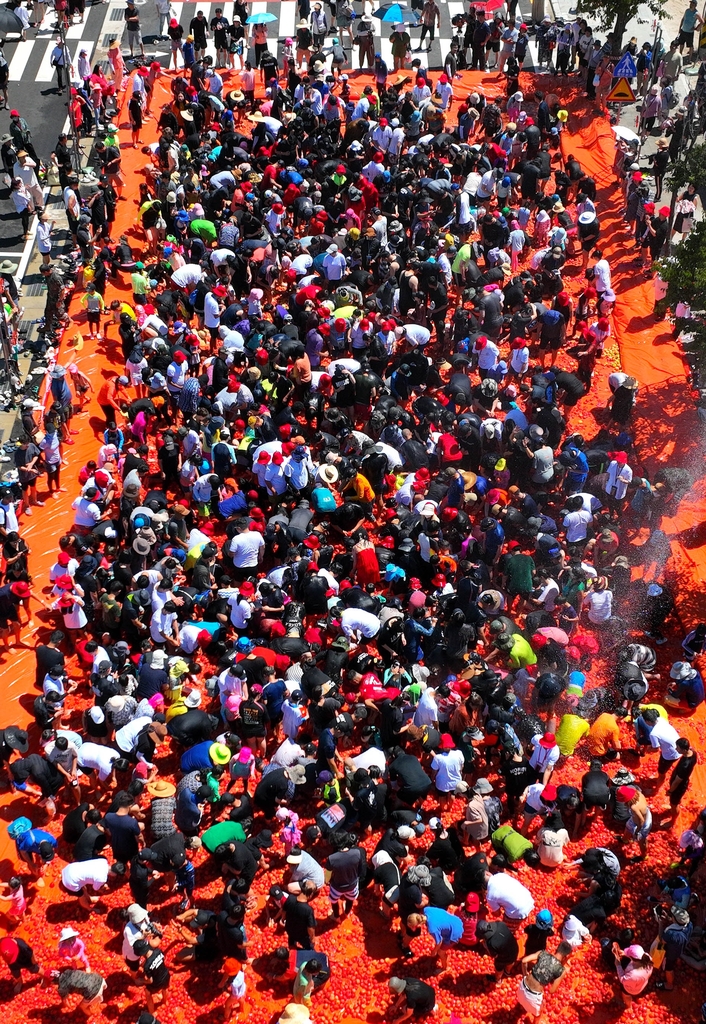 토마토가 뿌려진 공간에서 금반지를 찾는 이벤트에서는 회당(이날 총 2회) 1천여명이 넘는 관광객들이 토마토의 붉은 바다에 몸을 던졌다.