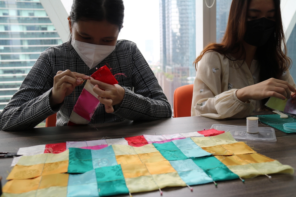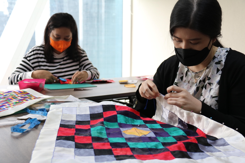 | ▲ 인도네시아 한류 '찐팬들', 한복·규방공예까지 (자카르타=연합뉴스) 성혜미 특파원 = 주인도네시아 한국문화원의 규방공예 수강생들이 조각보를 바느질하는 모습. 2022.4.21 noanoa@yn.co.kr |