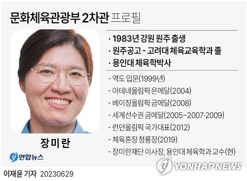| ▲ [그래픽] 문화체육관광부 2차관 프로필 (서울=연합뉴스) 이재윤 기자 = 윤석열 대통령은 29일 문화체육관광부 2차관으로 역도선수 출신인 장미란 현 용인대 체육학과 교수가 깜짝 발탁했다. yoon2@yna.co.kr 트위터 @yonhap_graphics 페이스북 tuney.kr/LeYN1 |