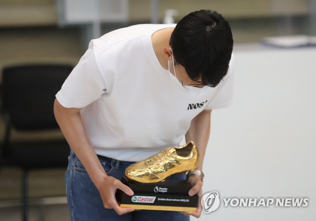 득점왕 트로피 '골든 부트'를 전달받은 손흥민은 이를 두 손으로 받쳐 들고서 팬들을 향해 연신 허리를 숙여 인사했다.