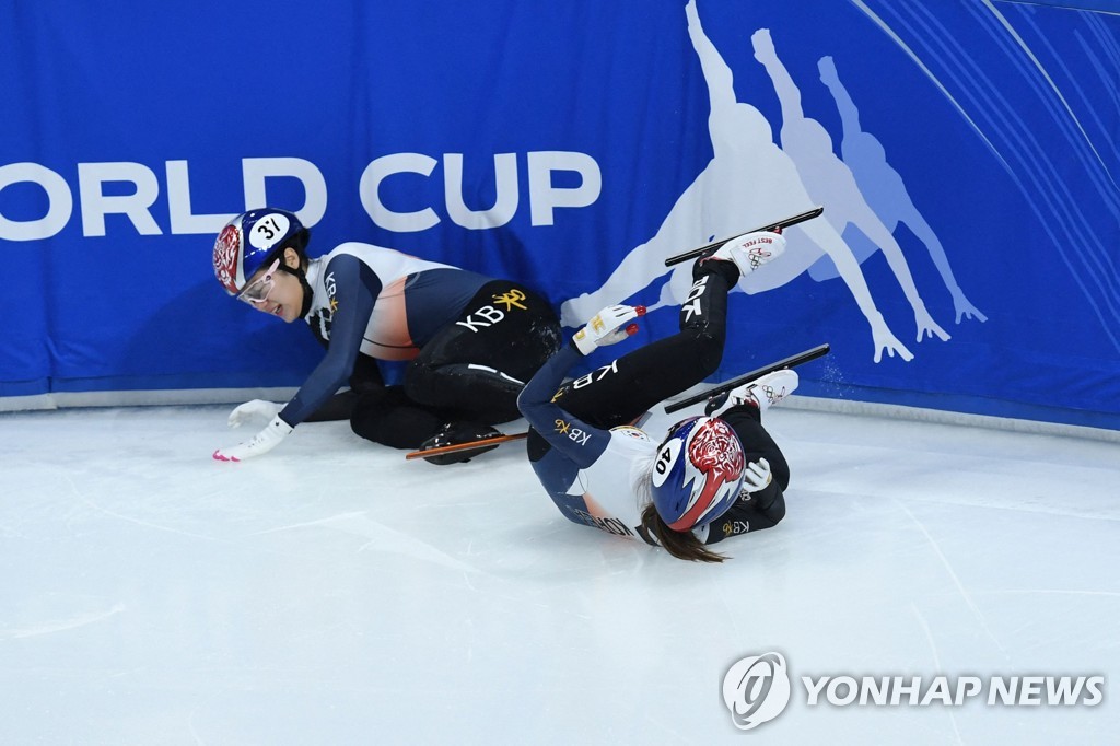 | ▲  In this AFP photo, Choi Min-jeong of South Korea (R) and Martina Valcepina of Italy fall during the women's 500m final at the International Skating Union Short Track Speed Skating World Cup at Capital Indoor Stadium in Beijing on Oct. 23, 2021. (Yonhap) |
