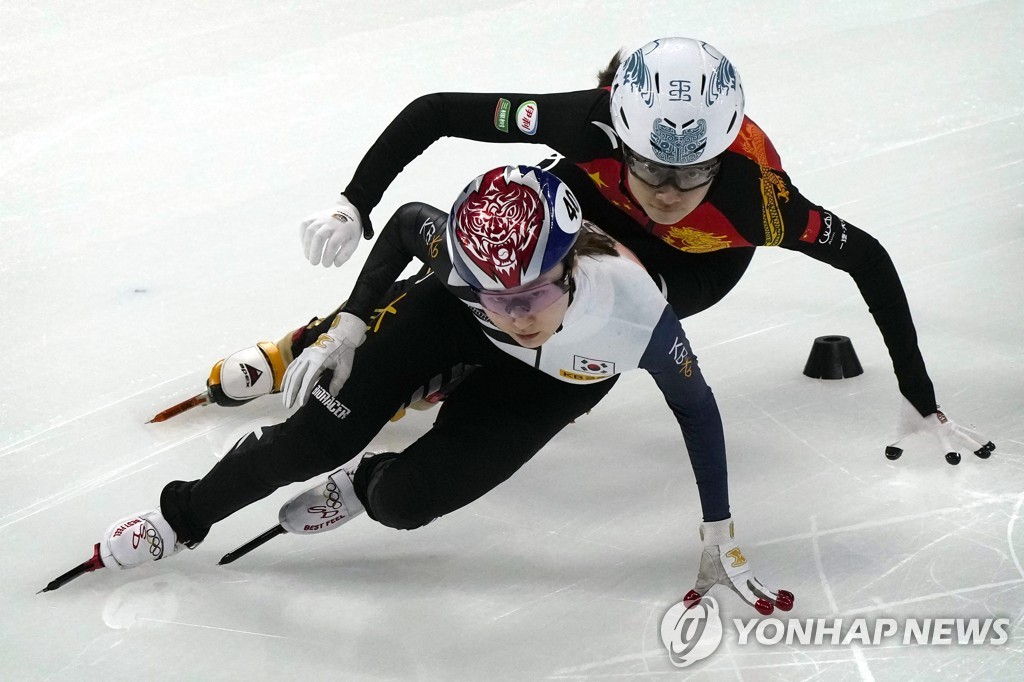 | ▲  In this Associated Press photo, Choi Min-jeong of South Korea (front) and Qu Chunyu of China compete in their heat of the women's 500m race at the International Skating Union Short Track Speed Skating World Cup at Capital Indoor Stadium in Beijing on Oct. 21, 2021. (Yonhap) |