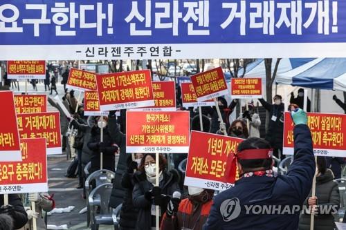 | ▲ This undated file photo shows shareholders of Sillajen Inc. waging a protest against the bourse operator to lift the trading suspension on the scandal-ridden bio firm. |
