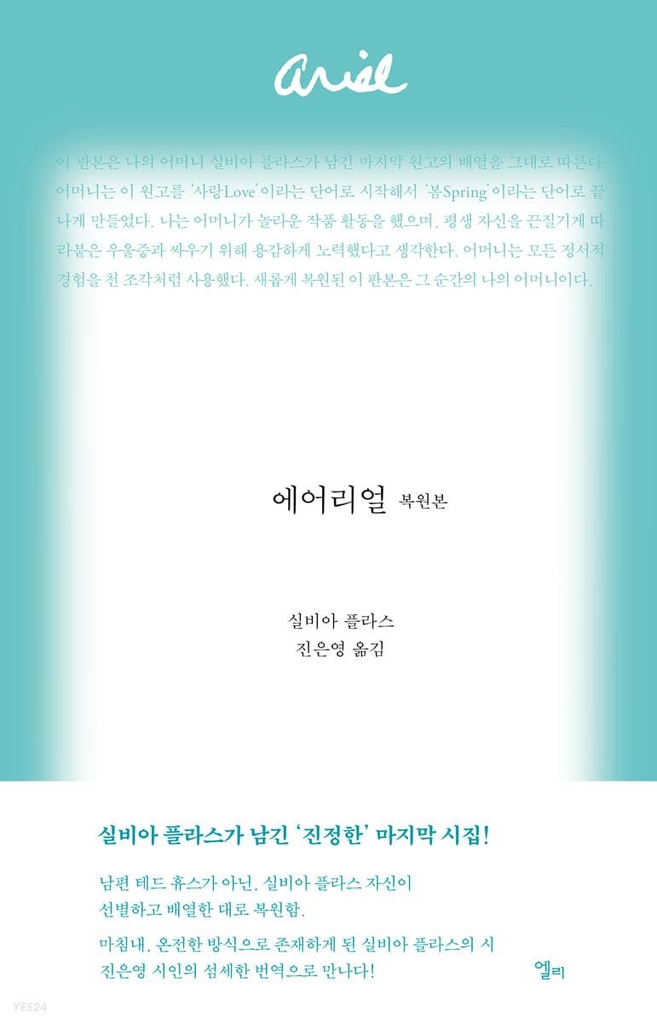 출판사는 복원본으로서의 사료적 가치를 위해 플라스가 타자기로 작성한 원고의 복사본, 표제시 '에어리얼'의 친필 원고 복사본을 수록했다고 소개했다.