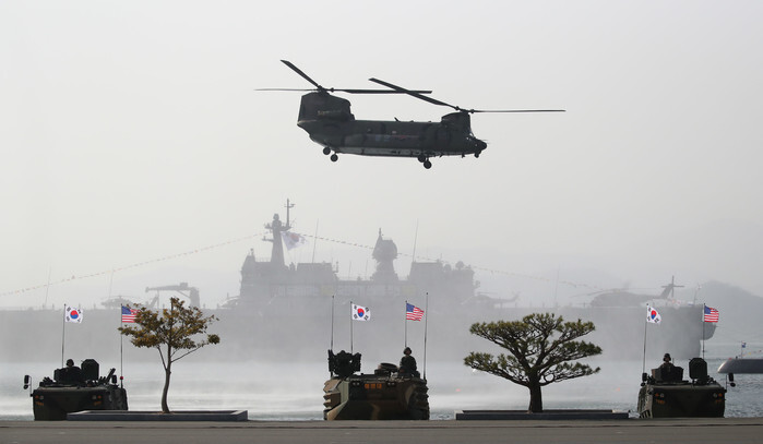 South Korean and U.S. Marines jointly demonstrate landing operations during a commencement ceremony of the Korea Naval Academy in Changwon, 301 kilometers south of Seoul, on March 10, 2023, on the occasion of the 70th anniversary of South Korea-U.S. alliance this year. (Pool photo) (Yonhap)