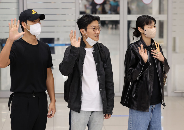 Director Hwang Dong-hyuk (C) and actors Park Hae-soo (L) and Jung Ho-yeon of "Squid Game" pose for a photo upon returning home at Incheon International Airport, west of Seoul on Sept. 15, 2022. The megahit Korean-language Netflix original series won best director and best actor awards at the 74th Emmy Awards in Los Angeles on Sept. 12. (Yonhap)