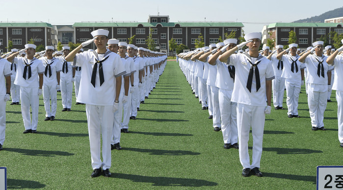 The 715th batch of Navy recruits take part in a ceremony at a boot camp in the southeastern city of Changwon on Aug. 1, 2025, to mark the completion of their five-week basic military training, in this photo released by the Navy. (PHOTO NOT FOR SALE) (Yonhap)