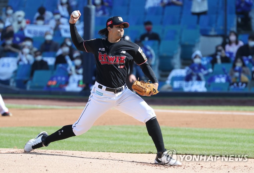 | ▲  William Cuevas of the KT Wiz pitches against the Samsung Lions in the bottom of the first inning of a Korea Baseball Organization tiebreaker game at Daegu Samsung Lions Park in Daegu, some 300 kilometers southeast of Seoul, on Oct. 31, 2021. (Yonhap) |
