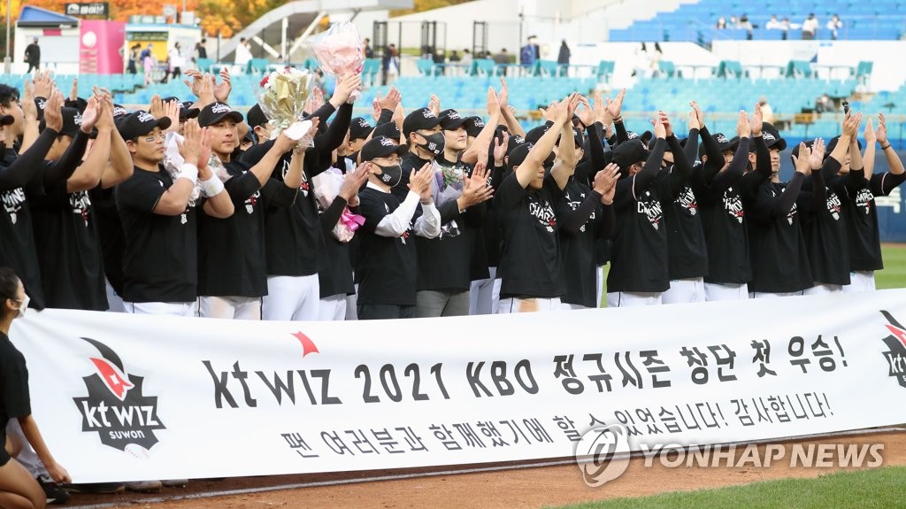 | ▲  Members of the KT Wiz celebrate winning the Korea Baseball Organization regular season title after beating the Samsung Lions 1-0 in a tiebreaker game at Daegu Samsung Lions Park in Daegu, some 300 kilometers southeast of Seoul, on Oct. 31, 2021. (Yonhap) |