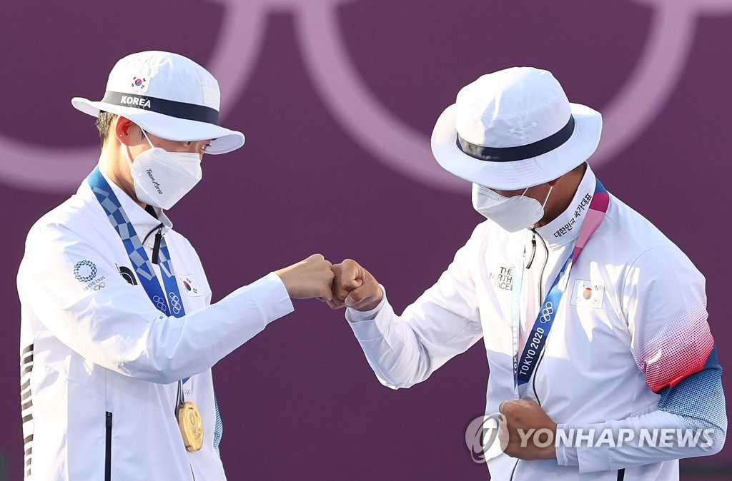 | ▲ South Korean archers An San (L) and Kim Je-deok bump fists after winning the gold medal in the mixed team event at the Tokyo Olympics at Yumenoshima Park Archery Field in Tokyo on July 24, 2021. (Yonhap) |
