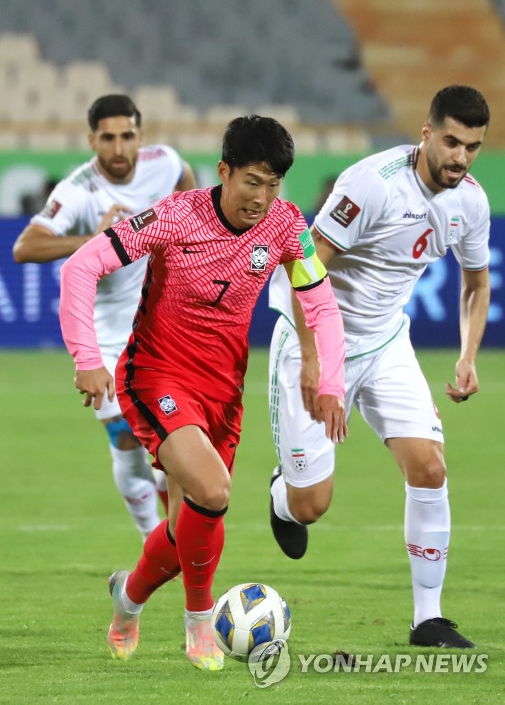 | ▲ Son Heung-min of South Korea (L) tries to dribble past Saeid Ezatolahi of Iran (R) during the teams' Group A match in the final Asian qualifying round for the 2022 FIFA World Cup at Azadi Stadium in Tehran on Oct. 12, 2021. (Yonhap) |