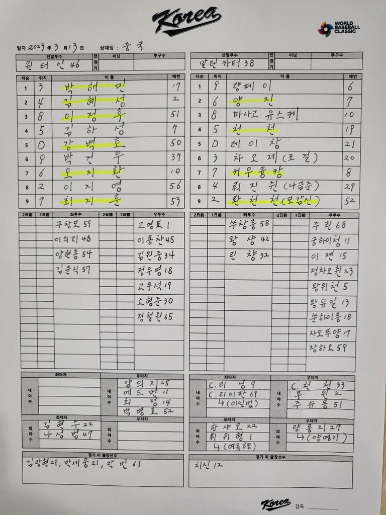 이강철 대표팀 감독은 13일 일본 도쿄 도쿄돔에서 열리는 제3회 WBC 1라운드 B조 중국과 최종전에 앞서 선발 출전 명단을 공개했다.