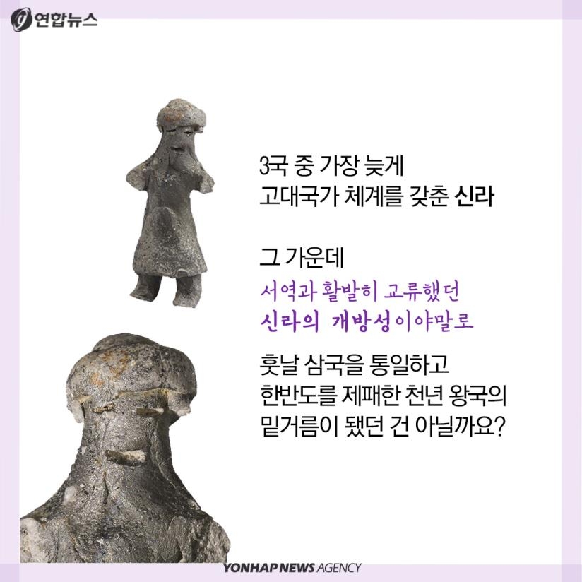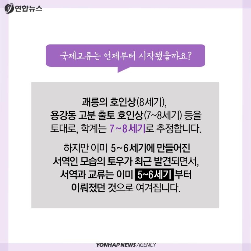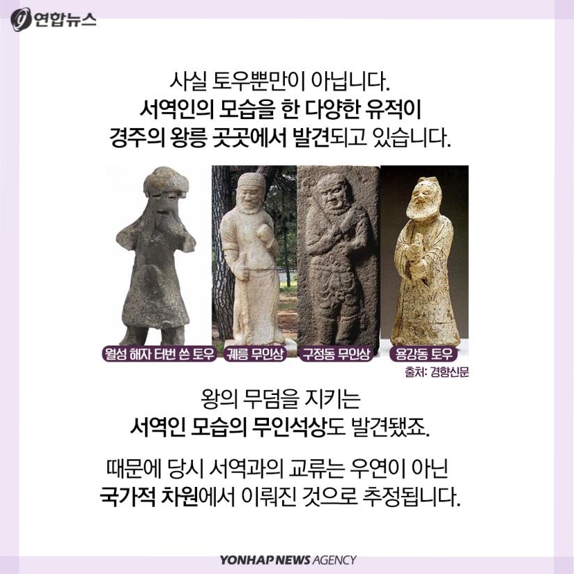 하지만 이미 5~6세기에 만들어진 서역인 모습의 토우가 최근 발견되면서, 서역과의 교류가 이미 5~6세기부터 이뤄졌던 것으로 여겨집니다.