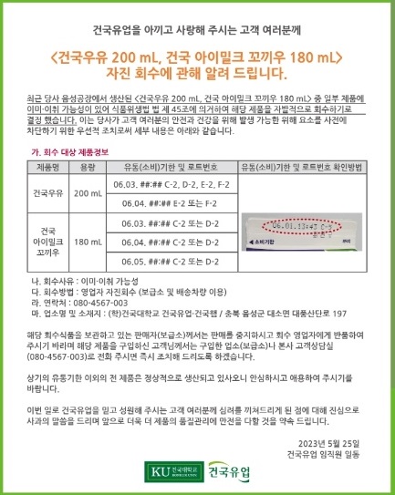 건국유업도 홈페이지에 공지문을 올리고 "일부 제품에 이미·이취 가능성이 있어 식품위생법에 따라 해당 제품을 자발적으로 회수하기로 결정했다"며 "고객 여러분의 안전과 건강을 위해 발생 가능한 위해요소를 사전에 차단하기 위한 우선적 조치"라고 설명했다.