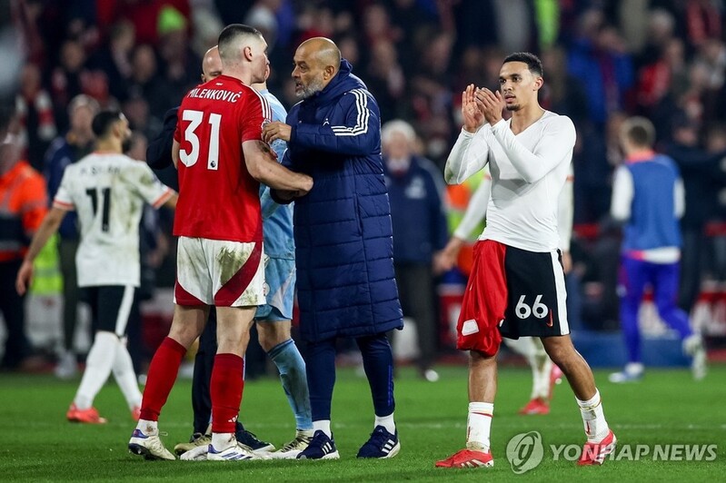 (서울=연합뉴스) 이영호 기자 = 2024-2025 잉글랜드 프로축구 프리미어리그(EPL) 최고 '돌풍의 팀'으로 꼽히는 노팅엄 포리스트가 '선두' 리버풀을 상대로 '장군·멍군'을 외치며 무승부를 따내고 정규리그 2위로 올라섰다.