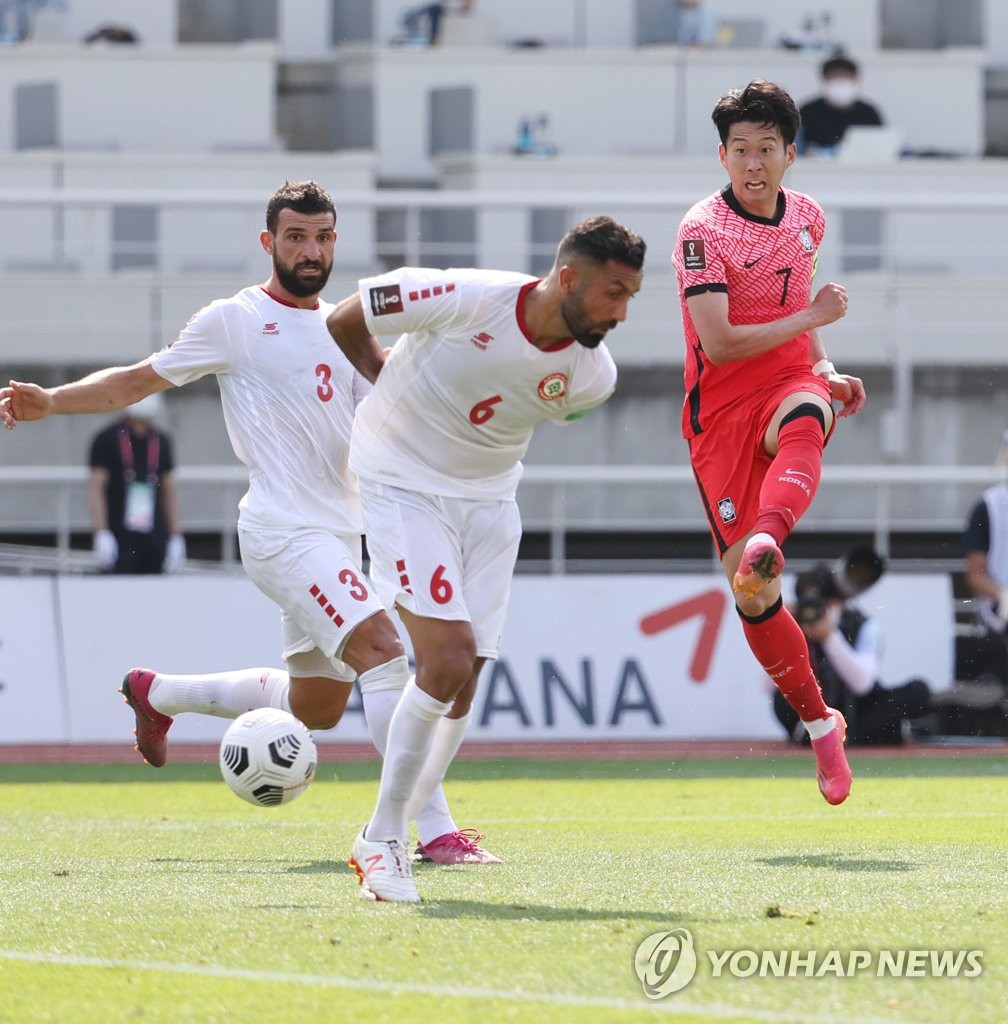| ▲ Son Heung-min of South Korea (R) takes a shot past Maher Sabra (L) and Joan Oumari of Lebanon during the teams' Group H match in the second round of the Asian qualification for the 2022 FIFA World Cup at Goyang Stadium in Goyang, Gyeonggi Province, on June 13, 2021. (Yonhap) |