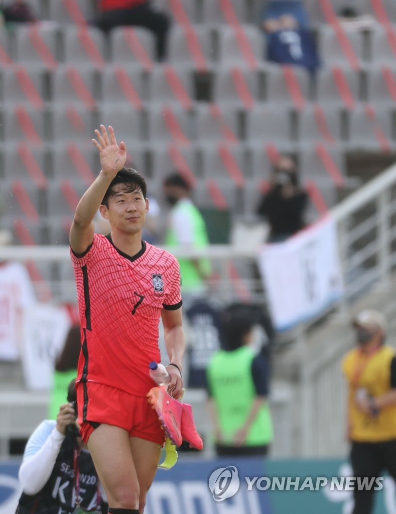 | ▲ Son Heung-min of South Korea waves to fans after a 2-1 victory over Lebanon during the teams' Group H match in the second round of the Asian qualification for the 2022 FIFA World Cup at Goyang Stadium in Goyang, Gyeonggi Province, on June 13, 2021. (Yonhap) |