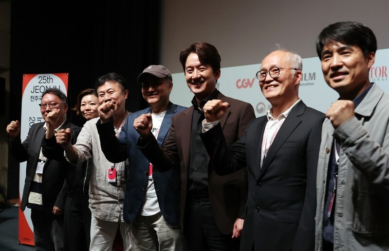 | ▲ "전주국제영화제 화이팅" (전주=연합뉴스) 나보배 기자 = 제25회 전주국제영화제가 폐막하는 10일, 전주디지털독립영화관에서 열린 결산 기자회견에서 민성욱(왼쪽 네번째)·정준호(왼쪽 다섯번째) 공동 집행위원장 등이 기념 촬영을 하고 있다. 2024.5.10 |
