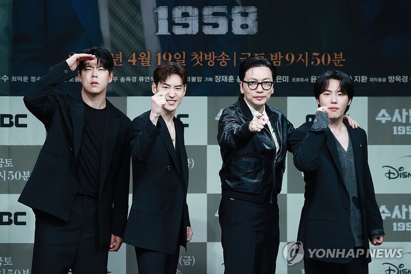 | ▲ 35년만에 돌아온 '수사반장' (서울=연합뉴스) 진연수 기자 = 18일 오후 서울 마포구 MBC 골든마우스홀에서 열린 MBC 새 금토드라마 '수사반장 1958' 제작발표회에서 출연 배우들이 포즈를 취하고 있다. 왼쪽부터 최우성, 이제훈, 이동휘, 윤현수. 2024.4.18 jin90@yna.co.kr |