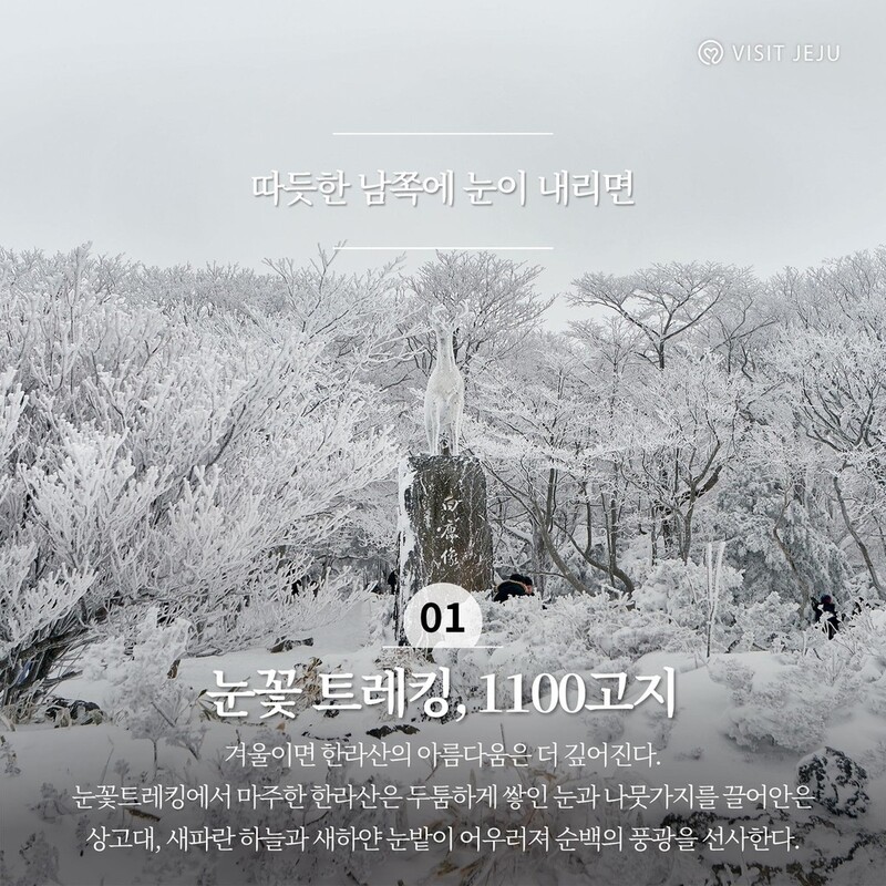 바다로 둘러싸인 따듯한 제주는 영상의 기온을 웃돌지만, 한라산 정상부는 겨울의 충만함으로 계절의 매력을 뽐낸다.
