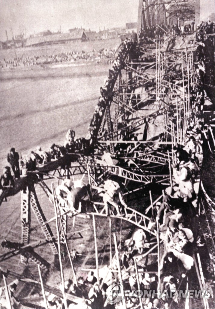 | ▲ 6·25 폭파된 대동강 철교 한국전쟁 당시 폭파된 대동강 철교의 모습. 많은 사람이 강물에 빠지지 않기 위해 철골구조물을 붙들고 안간힘을 쓰고 있다. [연합뉴스 자료사진] |