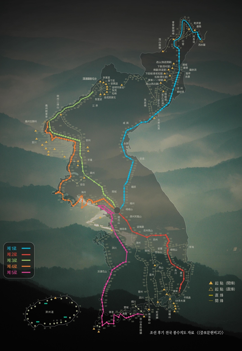 1900년대에 간행된 '증보문헌비고'(增補文獻備考)에 따르면 조선 후기에는 5개의 직봉, 23개의 간봉(間峯·주요 간선로 사이에 있는 작은 봉수망) 노선을 운영했다고 한다.