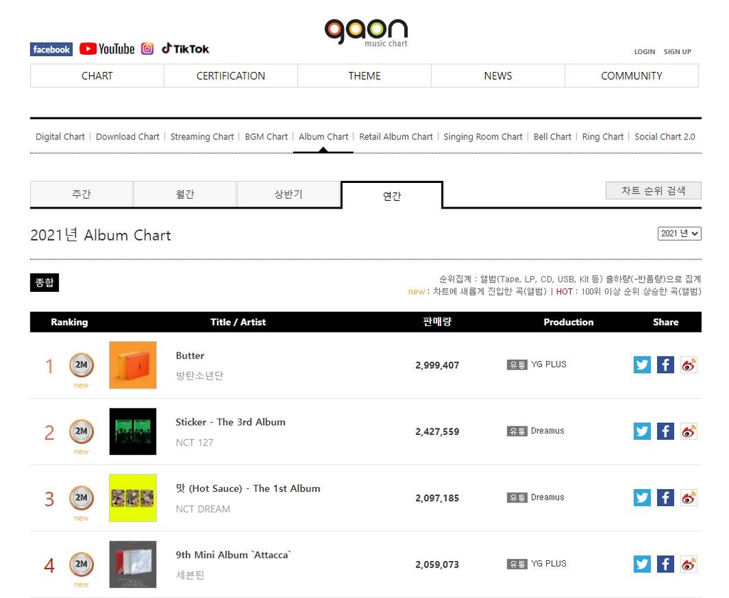 | ▲ 가온차트 2021년 앨범 차트 [가온차트 홈페이지 캡처. 재판매 및 DB 금지] |