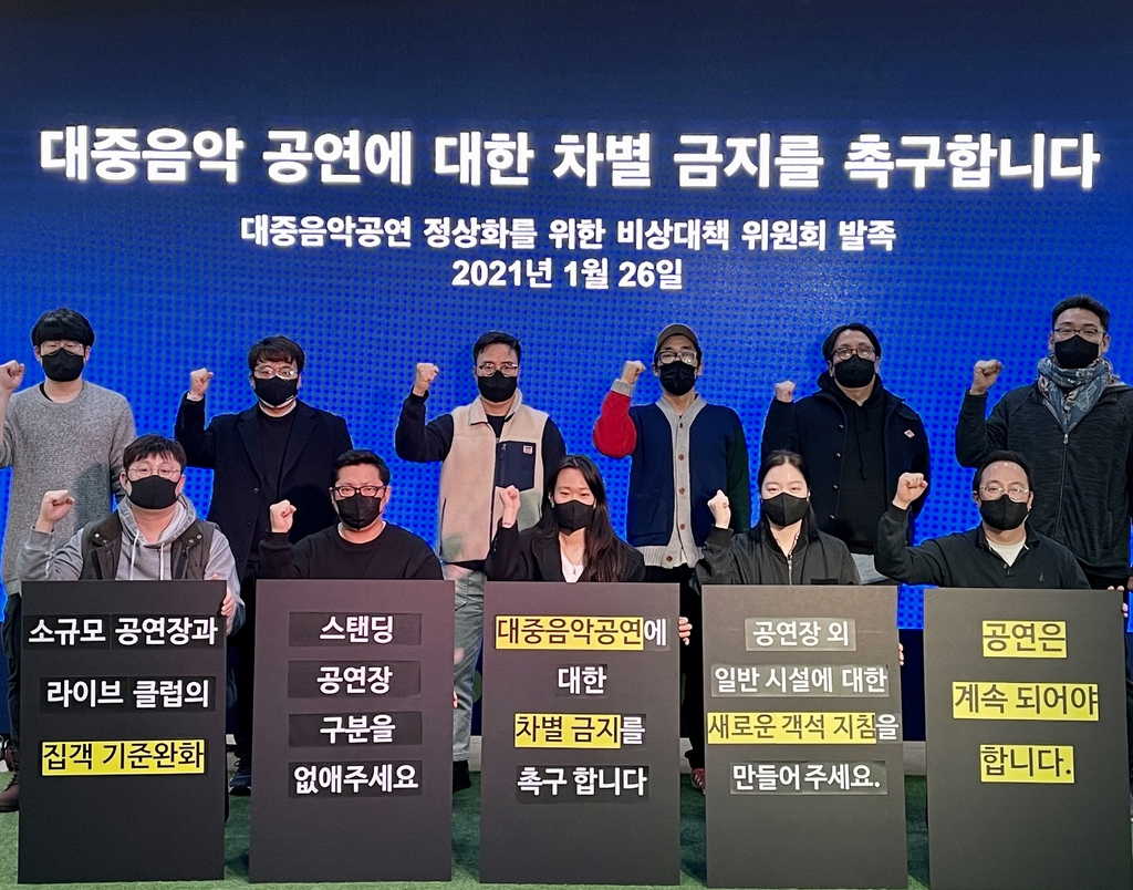 공연기획사, 제작사, 음악 레이블, 프로덕션, 아티스트 등으로 구성된 '대중음악공연 정상화를 위한 비상대책위원회'는 26일 대정부 호소문에서 "대중음악 공연은 뮤지컬, 연극, 클래식 등에 비해 훨씬 엄격한 기준 적용을 받았다"면서 "대중음악 공연에 대한 차별을 없애고, 최소한 타 장르 공연과 같은 기준으로 관객을 모을 수 있도록 해주길 바란다"고 촉구했다.