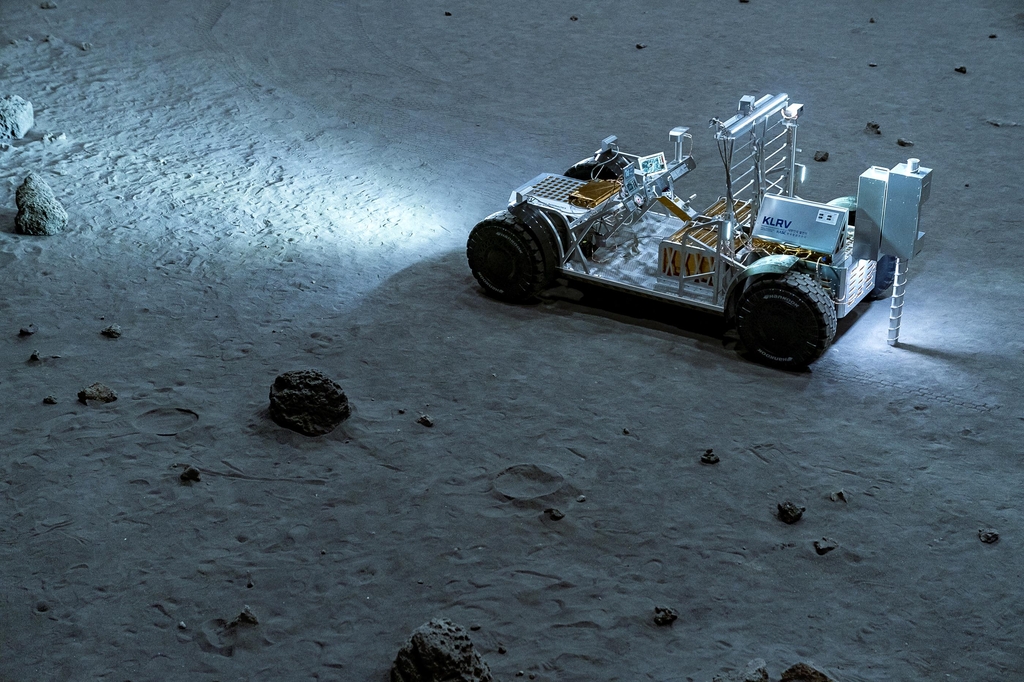 (서울=연합뉴스) 이영재 기자 = 달 착륙에 성공해 탐사 임무를 수행하던 우주인이 황급히 탐사 차량에 올라탄다.