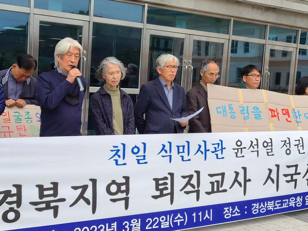 (안동·대구=연합뉴스) 김선형 기자 = 경북참교육동지회는 22일 경북도교육청 앞에서 기자회견을 열고 윤석열 대통령의 강제동원 해법과 관련해 "윤 대통령이 열어가려는 한국과 일본의 미래는 단지 굴욕적인 것을 넘어 나라와 국민의 생존을 위태롭게 한다"라며 퇴진을 요구했다.