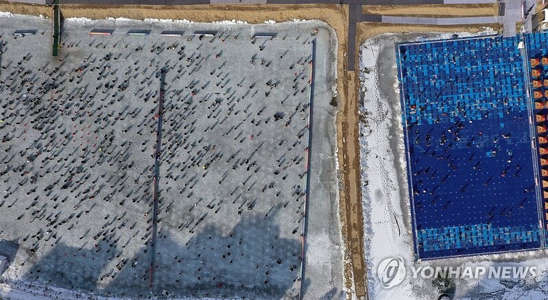 | ▲ 홍천강 얼음낚시터와 부교낚시터 (홍천=연합뉴스) 이상학 기자 = 강원특별자치도의 대표 축제인 '홍천강 꽁꽁축제'가 개막한 지 이틀째를 맞은 19일 많은 관광객이 홍천강 얼음위에 올라가 낚시를 하며 즐거운 시간을 보내고 있다. 오른쪽에 얼음이 제대로 얼지 않을 경우 대비해 만든 부교 낚시터가 보인다. 2025.1.19 hak@yna.co.kr |