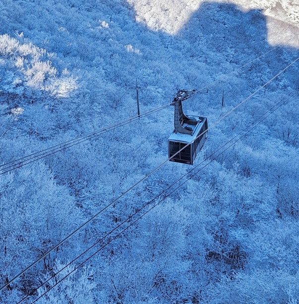 좀처럼 만나기 어려운 겨울 산의 백미, 상고대의 소식에 케이블카를 타고 고계봉을 찾는 방문객들도 줄을 잇고 있다.