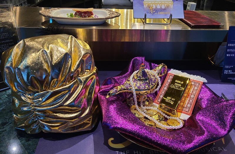 코스 음식들에는 '알라딘' 콘셉트를 녹였다. 양탄자에서 영감을 받은 파스타 면, 검은 동굴의 다이아몬드를 상징하는 트러플, 요술램프 모양의 과자, 뮤지컬 속 캐릭터 자스민을 떠올리게 하는 하늘색 칵테일까지 뮤지컬 '알라딘'을 맛으로 즐기게 하는 음식들이다.