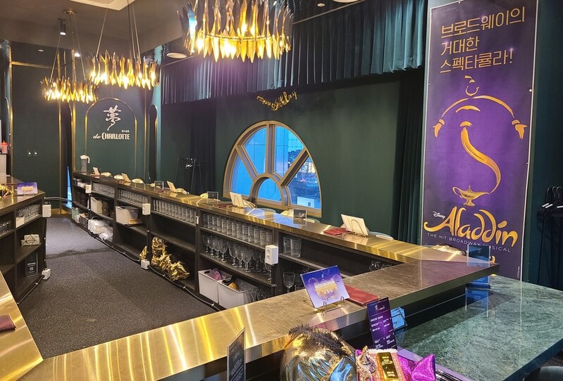 식당 안으로 들어서면 뮤지컬 '알라딘'에 나왔을 법한 의상을 입은 직원이 손님을 맞이한다. 터번을 비롯해 요술램프, 골드바 등의 소품도 눈길을 사로잡는다. 현재 샤롯데씨어터 무대에 오르고 있는 뮤지컬 '알라딘'에 맞춰 식당을 꾸몄다. 식당 배경 음악도 '아라비안 나이츠' 등 '알라딘'의 주요 넘버로 구성했다.