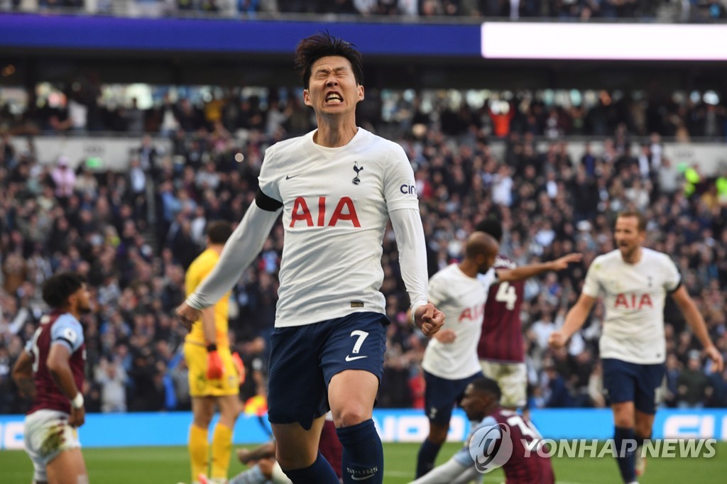 | ▲ In this EPA photo, Son Heung-min of Tottenham Hotspur celebrates after setting up a goal against Aston Villa during the clubs' Premier League match at Tottenham Hotspur Stadium in London on Oct. 3, 2021. (Yonhap) |