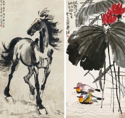 | ▲ 쉬베이훙(徐悲鴻), 〈전마(戰馬)〉, 1942, 종이에 먹, 색, 110.5×61.3cm, 중국미술관 소장(왼쪽), 치바이스(齊白石) 〈연꽃과 원앙(荷花鴛鴦)〉, 1955, 종이에 먹, 색, 137.7×67.8cm, 중국미술관 소장[국립현대미술관 제공. 재판매 및 DB 금지] |