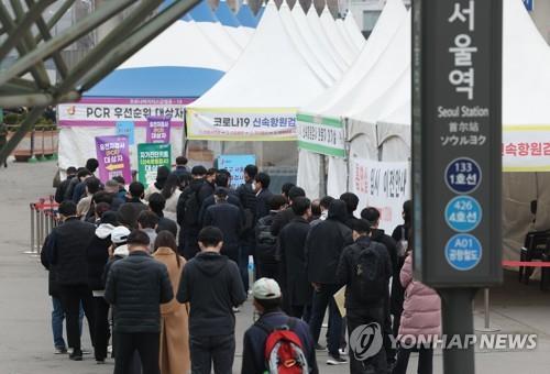 | ▲ People stand in line to take coronavirus tests at a screening clinic in front of Seoul Station on March 23, 2022. |