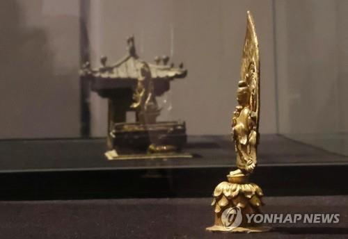 | ▲ 경매 나온 국보 2점 (서울=연합뉴스) 이재희 기자 = 서울 강남구 케이옥션에서 국보 '금동계미명삼존불입상'(오른쪽)과 국보 '금동삼존불감'을 전시하고 있다. |