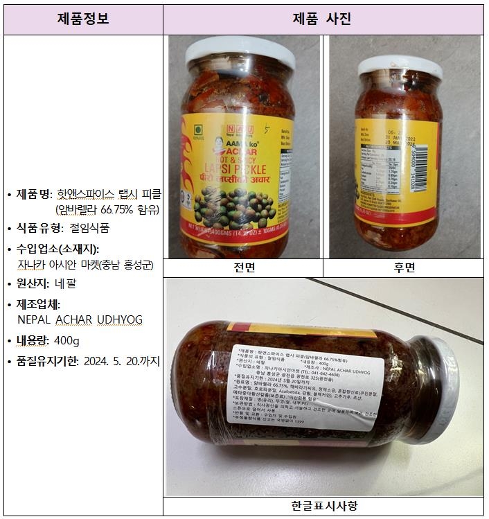 | ▲ 회수 조치된 네팔산 '핫앤스파이스 랩시 피클' [식약처 제공] |