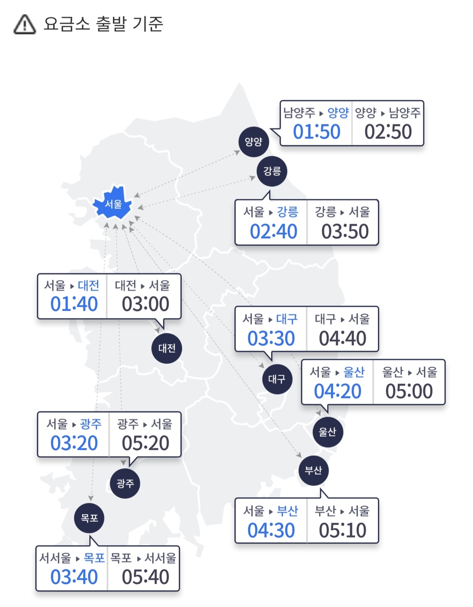반대로 서울에서 각 도시까지 소요 시간은 부산 4시간 30분, 울산 4시간 20분, 광주 3시간 20분, 대구 3시간 30분, 강릉 2시간 40분, 대전 1시간 40분이다.