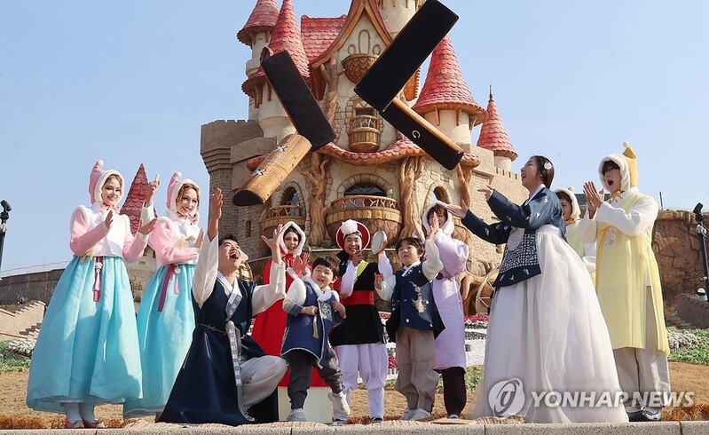 | ▲ 민속놀이 한마당 (부산=연합뉴스) 강선배 기자 = 22일 부산 기장군 롯데월드 어드벤처 부산에서 한복을 차려입은 모델들이 윷놀이를 시연하고 있다. 롯데월드 부산은 설 연휴 기간인 27일부터 30일까지 로얄가든 광장에서 투호와 제기차기, 비석치기와 같은 민속놀이 한마당을 운영한다. 2025.1.22 sbkang@yna.co.kr |