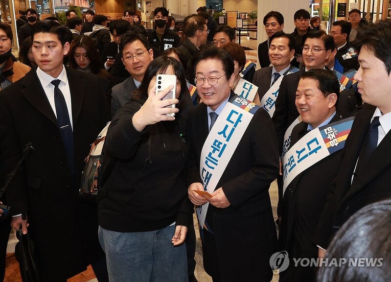 | ▲ 귀성 인사 나선 이재명 대표 (서울=연합뉴스) 한종찬 기자 = 더불어민주당 이재명 대표가 24일 오전 설 귀성 인사를 위해 서울 서초구 고속버스터미널을 찾아 한 시민과 셀카 사진을 찍고 있다. 2025.1.24 saba@yna.co.kr |