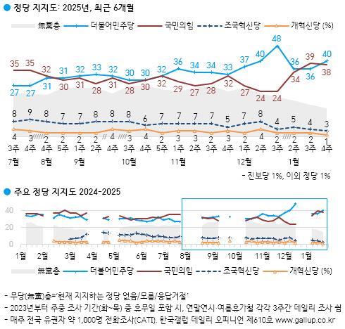 지난 14∼16일(1천 1명 대상) 기준 조사에서는 국민의힘이 39%, 민주당이 36%였고, 그 전주(1월 7∼9일·1천 4명 대상)에는 국민의힘이 34%, 민주당이 36%였다.