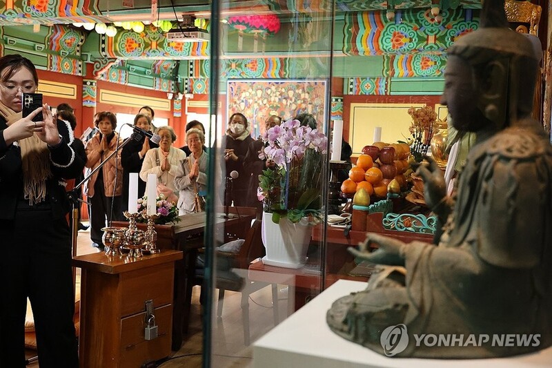 | ▲ 고려시대 금동관세음보살좌상 바라보는 불자 (서산=연합뉴스) 강수환 기자 = 1378년 왜구에 약탈당했던 고려시대 금동관세음보살좌상이 647년 만인 24일 오후 충남 서산 부석사로 옮겨져 처음으로 일반에 공개됐다. 이날 부석사 설법전에서는 불상이 돌아온 사실을 부처님께 고하는 고불식을 거행했다. 고불식에 참석한 불자들이 불상을 바라보고 있다. 불상은 부처님오신날인 5월 5일까지 100일간 매일 공개된다. 2012년 절도범이 일본 사찰 간논지(觀音寺)에서 훔쳐 국내로 들여왔으나 우리나라 대법원에서 최종적으로 일본 소유권을 인정했다. 불상은 5월 5일 이후에 국립문화유산연구원으로 반환된 뒤 일본으로 돌아간다. 2025.1.24 swan@yna.co.kr |